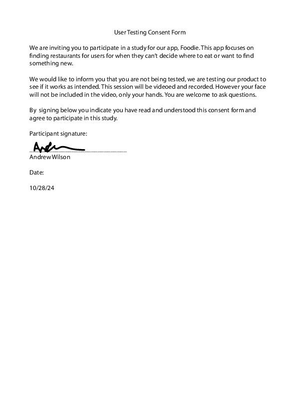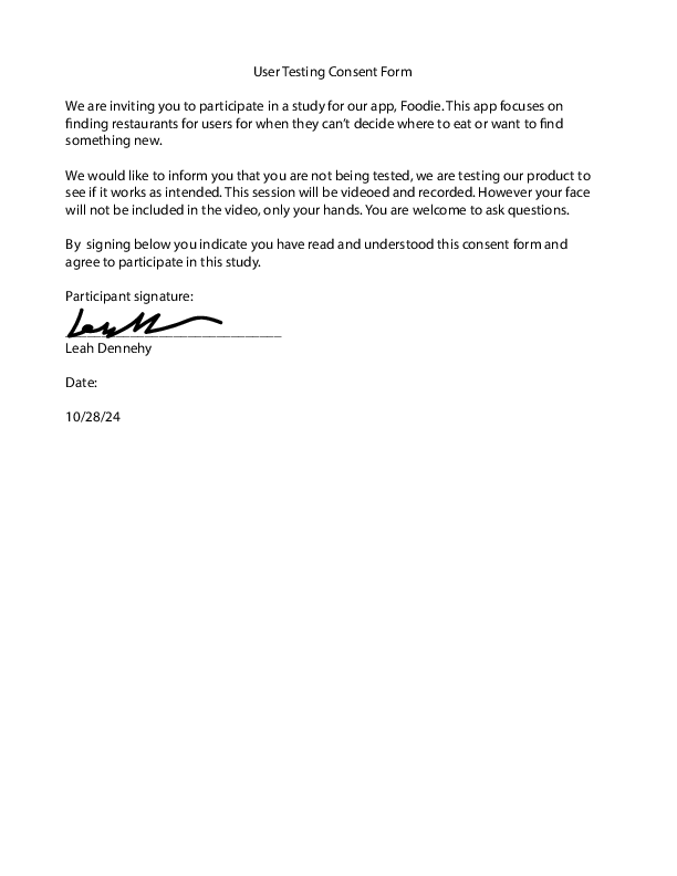 Hello, welcome and thank you for your participation. The reason we have you here today is we are testing our product Foodie to see if our app works as intended. Foodie is an app that finds restaurants for you. Whether you’re having trouble deciding or you want to try something new, this app is made to help users find a restaurant for them. You are welcome to end the test at any time.